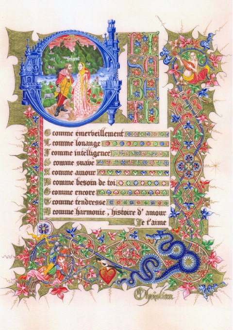 Enluminure personnalisée pour un cadeau d'anniversaire et réalisée dans le style des Heures Visconti, pour un particulier, sur le thème de l'amour courtois et de l'Extreme-Orient tel qu'il pouvait être perçu au Moyen Age.